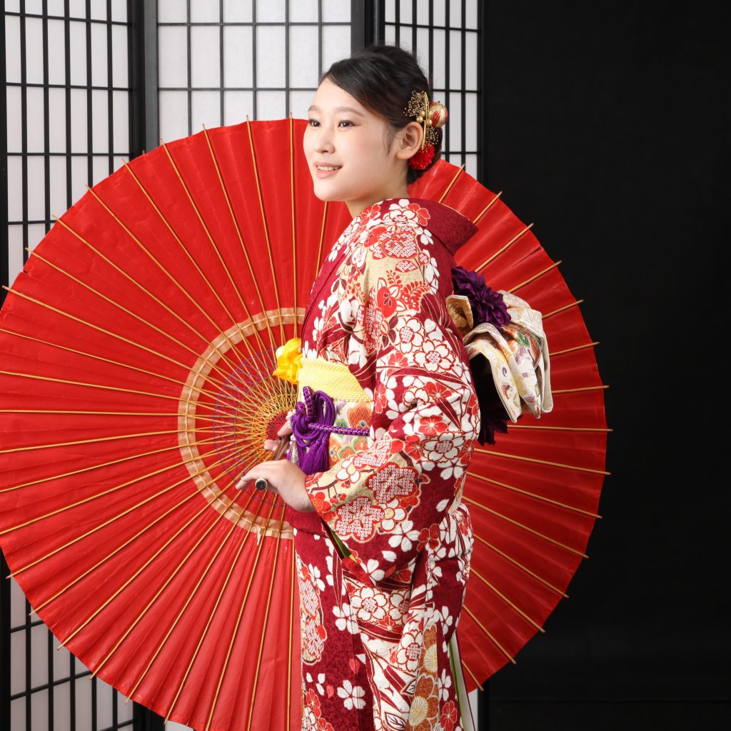 深い赤に古典柄がとても上品なお着物で、涼やか美人さんなお嬢様に大変良くお似合い💕